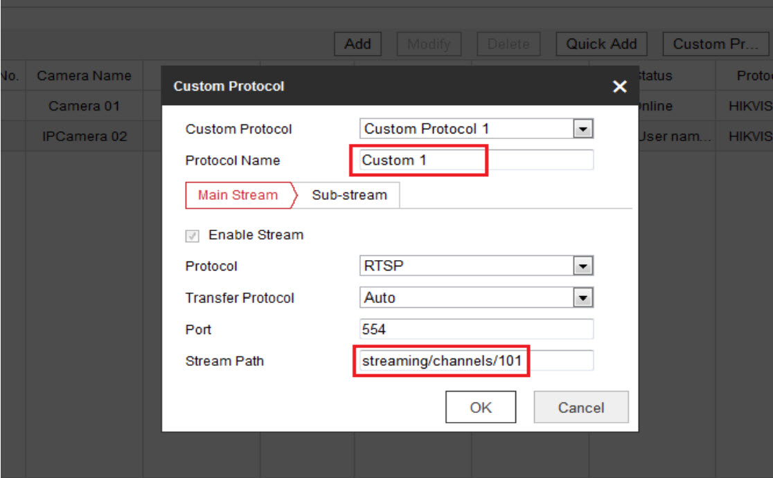 - Giao thức tùy chỉnh được tạo bởi người dùng với cổng RTSP và 554. Sau đó, các camera IP có thể được thêm vào NVR bằng giao thức tùy chỉnh để có được luồng trực tiếp.