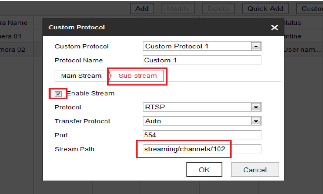 - 4 . Nhấp vào Sub stream và Enable Stream, sau đó gõ vào Stream Path của luồng phụ Sub stream: streaming/channels/102