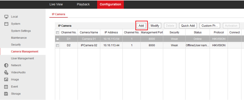 - 1 . Vào Cấu hình->hệ thống->Quản lý camera->Camera IP và nhấp vào Thêm Add