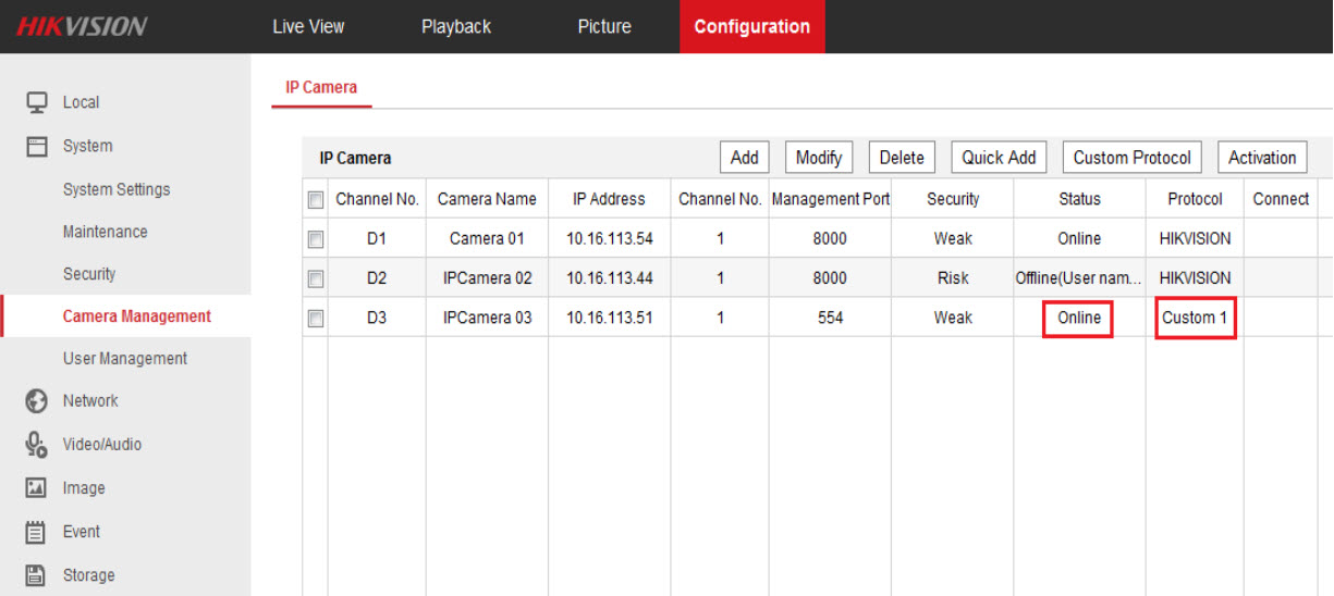 - 3 . Cuối cùng camera IP đã online với Custom 1 thành công.