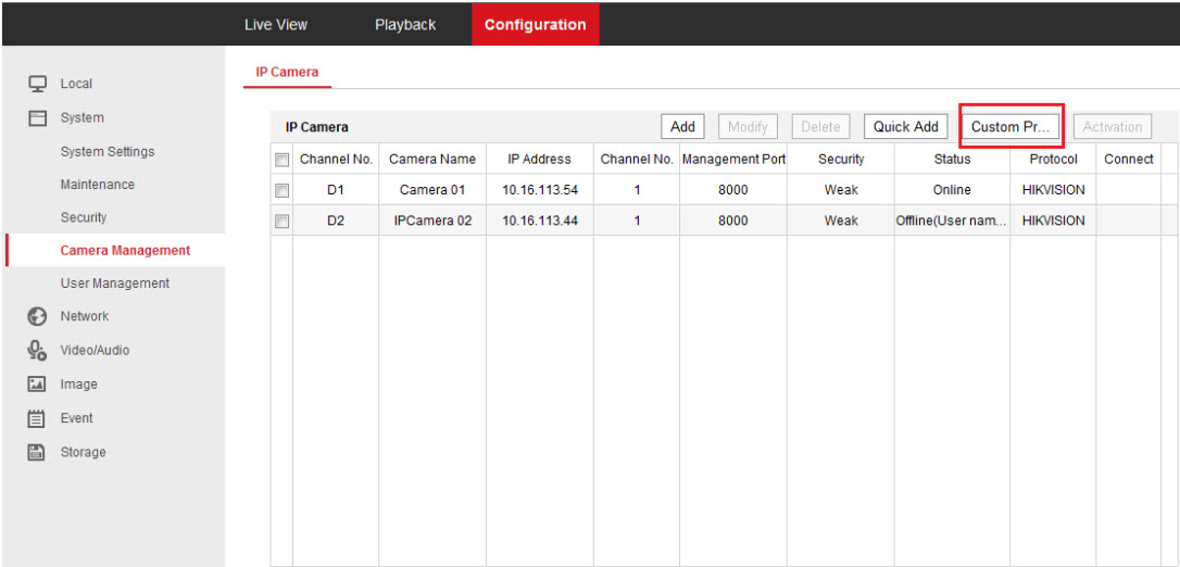 - 2 . Đăng nhập trang web của NVR, vào Cấu hình->hệ thống->Quản lý camera->Camera IP, nhấp vào Giao thức tùy chỉnh Custom Protocol