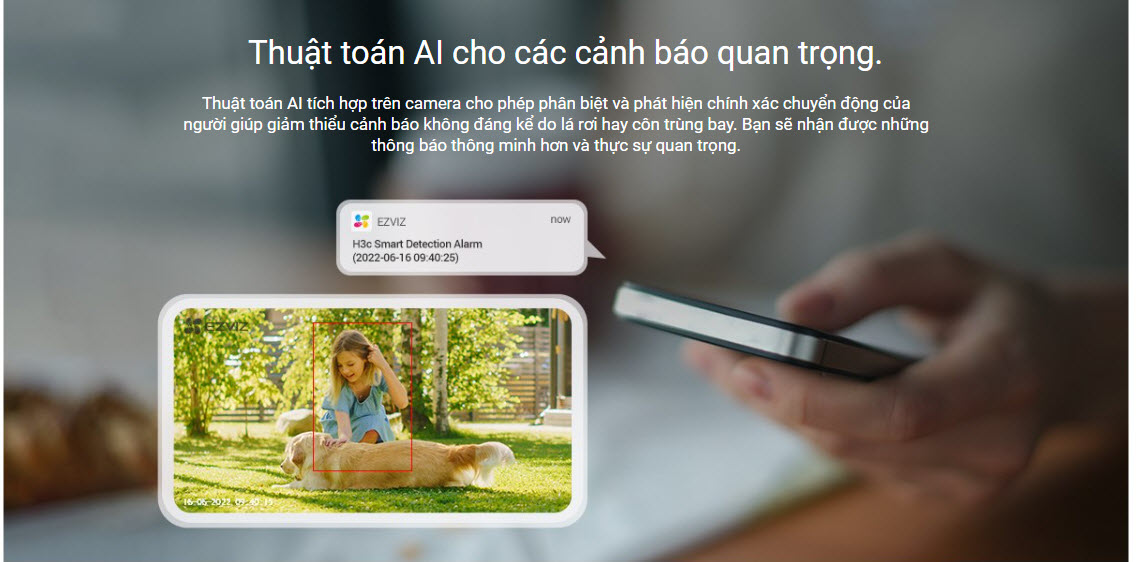 - Camera Ezviz được trang bị công nghệ trí tuệ nhân tạo (AI), cho phép thiết bị nhận diện và phân biệt giữa người và các vật thể khác trong khung hình. Tính năng này giúp cải thiện hiệu quả giám sát và giảm thiểu số lượng cảnh báo giả.