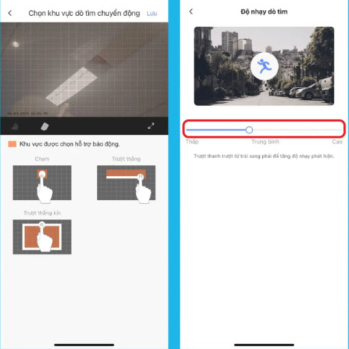 Hoặc chọn “Độ nhạy dò tìm” để điều chỉnh mức độ nhạy của camera với các chuyển động. Bạn có thể chọn từ độ nhạy thấp đến cao, tùy thuộc vào mức độ phát hiện mà bạn mong muốn.