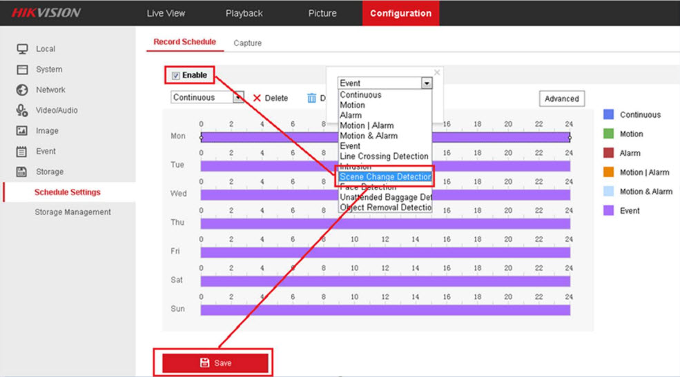 - Vào mục Configuration> Storage> Schedule Setting, bật Record Schedule, sau đó cài đặt lịch Scene Change Detection, và nhấn Save.