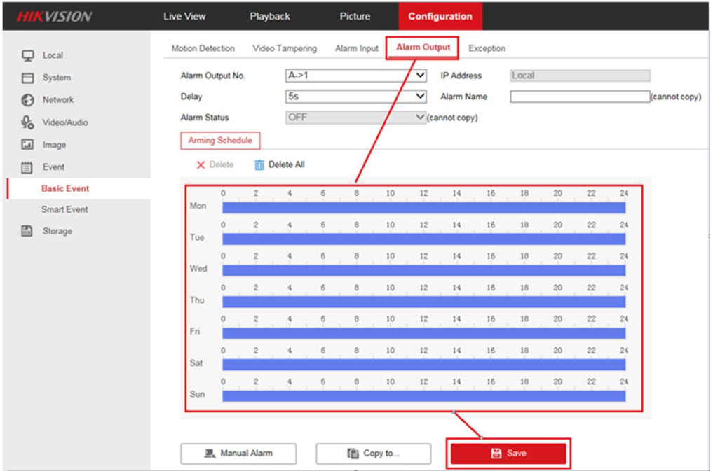 - Vào mục Configuration> Event> Basic Event> Alarm Output, và cài lịch kích hoạt Arming Schedule, sau đó nhấn Save.