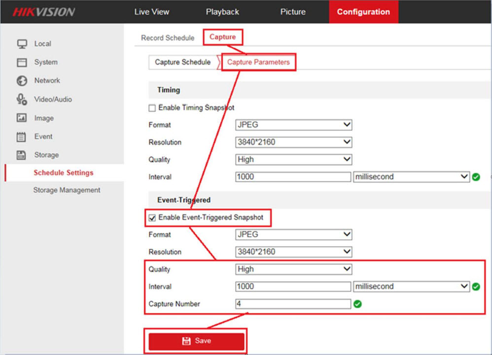- Vào mục Configuration> Storage> Schedule Setting> Capture> Capture Parameter, bật Event-Triggered Snapshot, cài các thông số Quality, Interval & Capture Number, và nhấn Save.