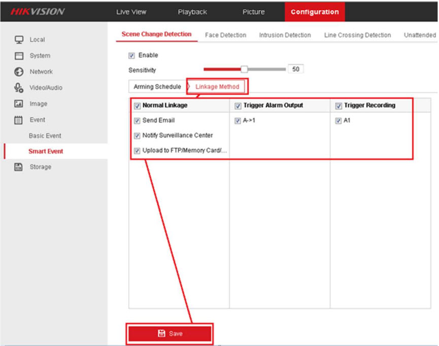- Vào giao diện Linkage Method, bật Notify Surveillance Center, Send Email, Upload to FTP/Menory Card/Nas, Trigger Alarm Output và Trigger Recording. Nhấn Save.